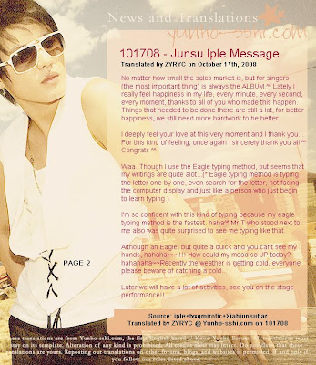 Jaejoong: Yunho, is my friend! When I'm exhausted and powerless, he has the strength that I don't have. Yesterday...at dawn yesterday Yunho gave me some support too. I'm happy with our 5 members' current situations, and because of this happiness, I always think: as time goes by, will this happiness disappear? Suddenly I feel unsettled. Maybe it's because autumn is coming. Yunho is different from me; he always looks towards the positive sides. He's always been like this, and I hope in the future he'll still be there to support me. He's really the best leader. Thank you!